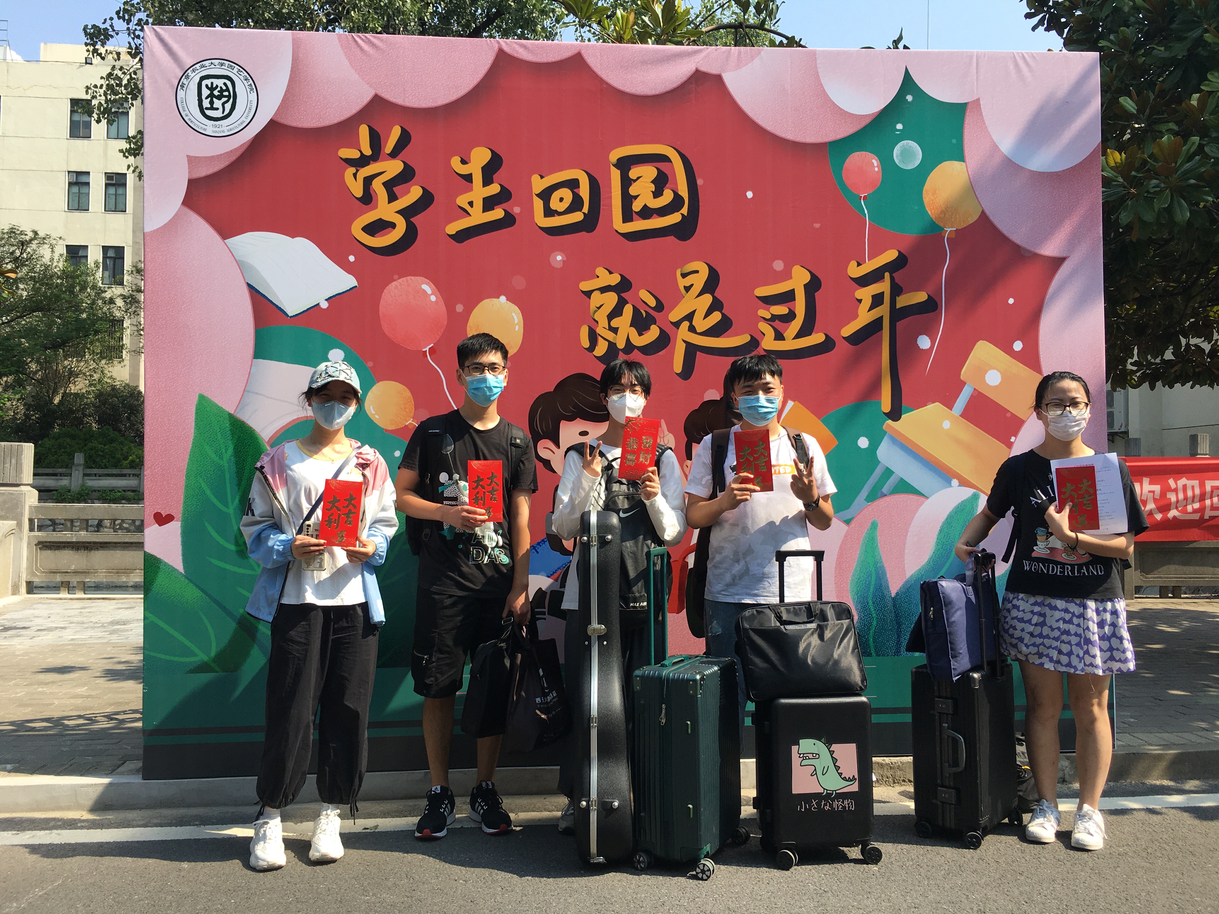 ”手持牌,让归校的学子们纷纷合影,弥补自己离校半载的缺憾。