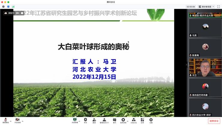 本次论坛特邀西北农林科技大学徐炎教授、中国农业大学马男教授和河北农业大学马卫教授做主旨报告。徐炎教授围绕中国野生葡萄抗霜霉病分子机理展开报告,马男教授对月季花朵开放品质调节机制研究进行了分享,马卫教授通过专题报告向大家揭示了大白菜叶球形成的奥秘。