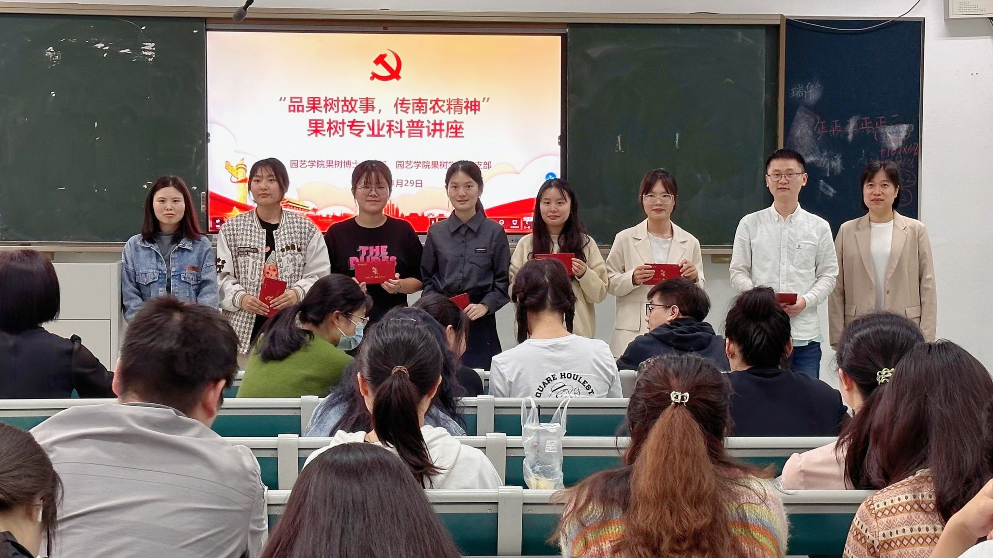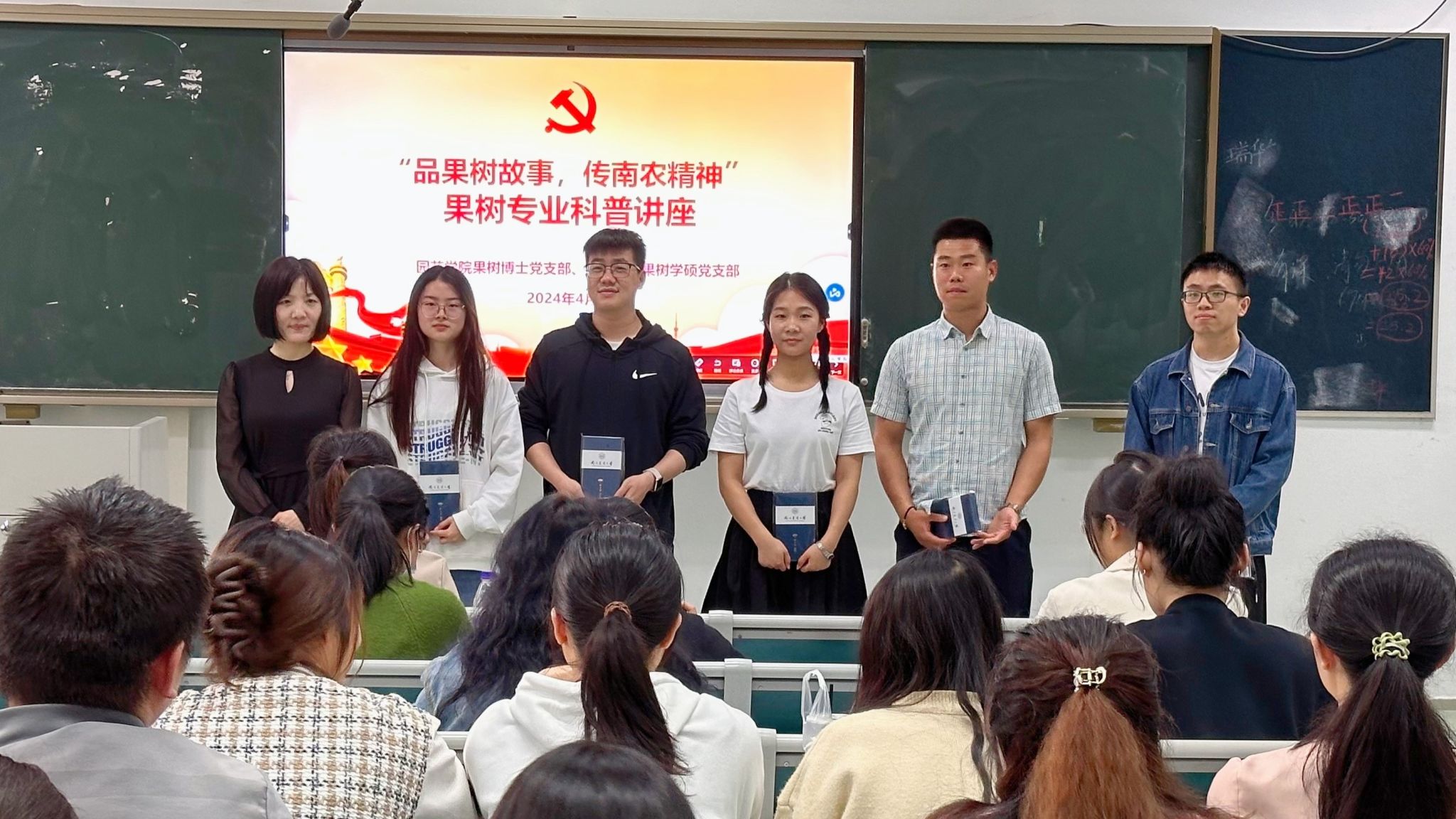 果树博士党支部和果树学硕党支部共同开展“品果树故事,传南农精神”果树专业科普讲座主题党日共建活动。科普讲座由金则滔同志主持,两个研究生支部的党员同志参加活动。