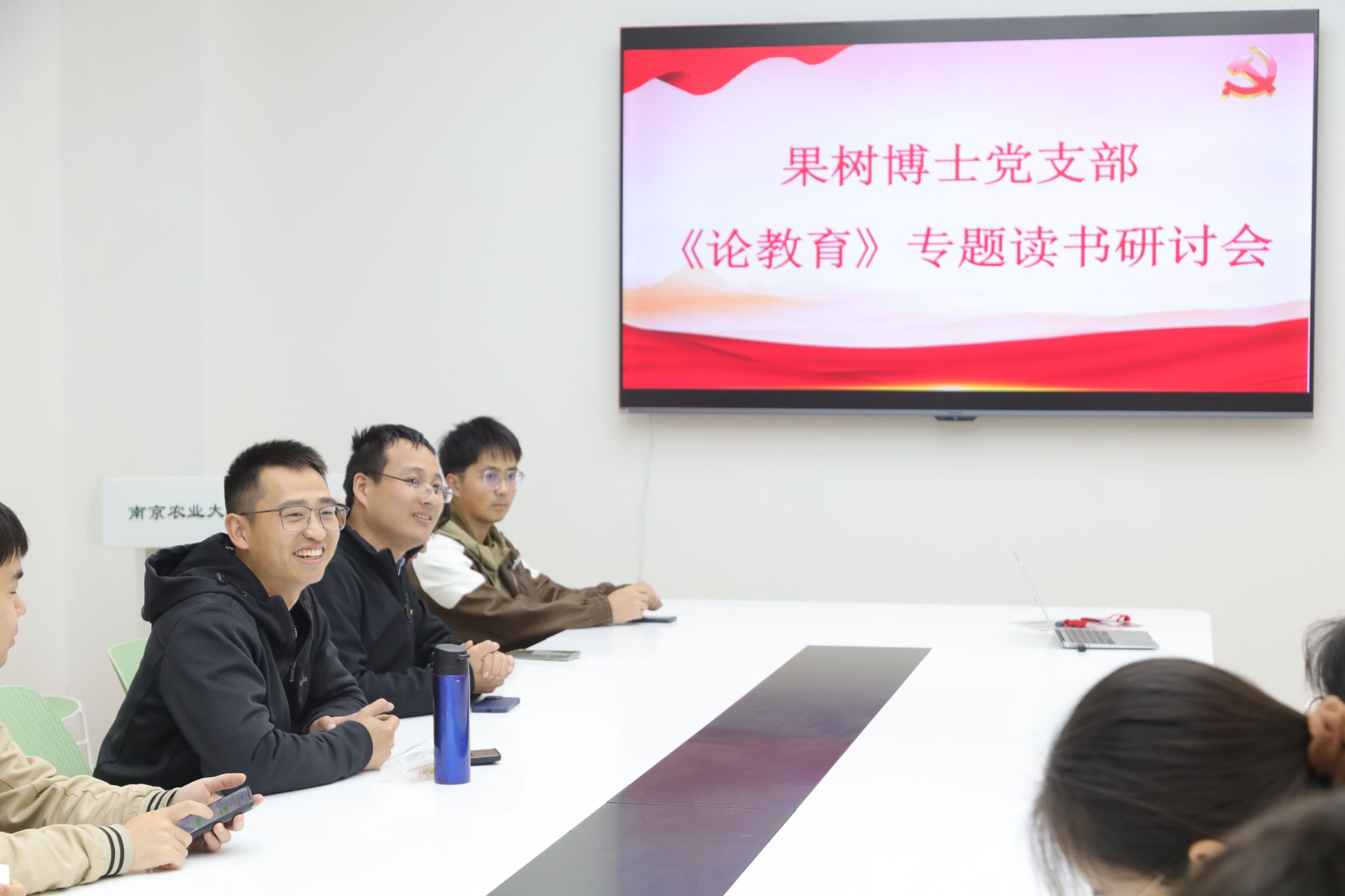 20241119日下午,果树博士生党支部在成人影院 楼134会议室开展《论教育》专题读书研讨会,党支部书记王鹏带领大家共同学习《论教育》的出版背景以及主要内容。