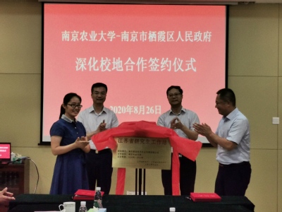 研究生院副院长张阿英、八洲街道工委书记、栖霞现代农业产业园区管委会主任倪天华为共建“江苏省研究生工作站”揭牌。