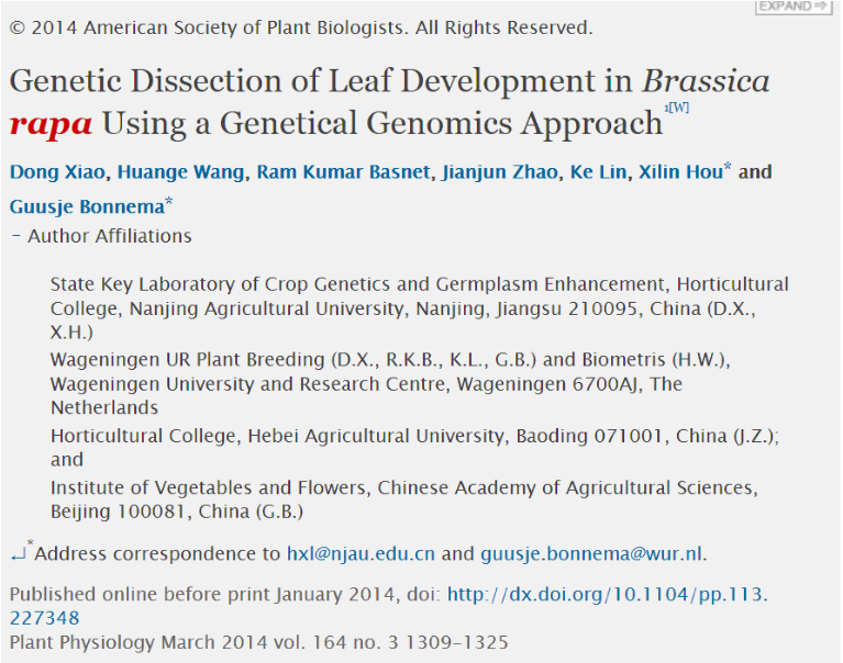 白菜系统生物学实验室与荷兰瓦赫宁根大学(Wageningen University)植物育种系合作完成的研究论文"Genetic dissection of leaf development in Brassica rapa using a genetical genomics approach"在《Plant Physiology》上发表,影响因子为6.555。肖栋博士为第一作者,侯喜林教授与Guusje Bonnema教授为共同通讯作者,成人影院
