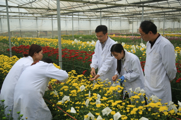 陈发棣带领团队历经20多年的积淀,先后收集保存菊花及其近缘种属植物5109份,保存数量居世界首位;从中鉴定出菊花近缘种属抗蚜、耐寒等优异抗性种质78份;并首次发现了黄金艾蒿、细裂亚菊分别是菊花抗蚜、耐寒育种的最优种质;首创基于控制授粉、胚珠拯救和杂种多色基因组原位杂交鉴定的菊花属间抗性种质创制技术,创建属间抗性种质利用和分子标记辅助选择相结合的菊花高效育种技术,在此基础上,突破了抗性和花色、花型、株型等性状的综合改良,率先育成绿色、乒乓型和风车型等优质高抗新奇特菊花新品种49个,为我国菊花品种更新和产业升级做出了重要贡献。值得一提的是,近年来,团队不仅深耕菊花的基础研究,还积极面向产业经济主战场,开展精准扶贫,激活农家庭院经济,帮助农村增收农民致富,其中,在贵州麻江的菊花产业扶贫,还入选了教育部精准扶贫的十大案例。团队创建的“菊花园”模式在全国20多个省市推广复制,在我国的美丽乡村建设、休闲旅游农业发展中发挥了重要作用。