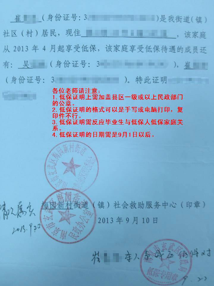 1、低保证明须包含毕业生姓名、身份证号等信息,由县(区)级以上民政部门开具并提供原件(可参照附件3)。2017届毕业生的低保证明在2016年9月1日(含)后开具的有效。