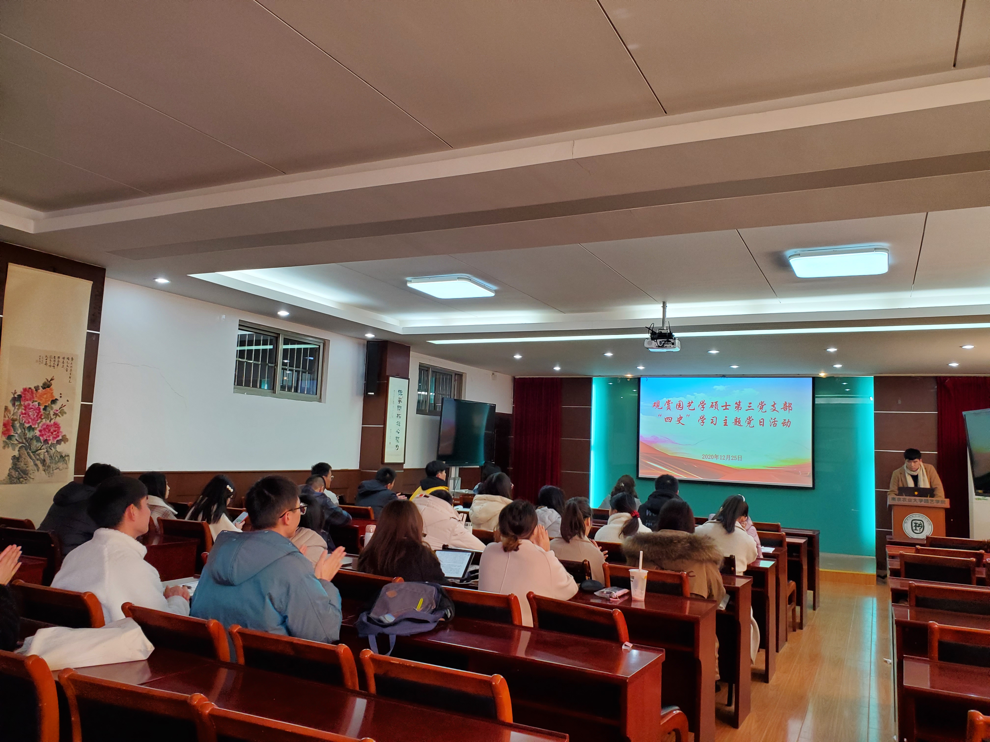 硕士第三党支部于生科楼B4011教室成功举办“四史”学习主题党日活动。全体党员、预备党员、积极分子参加本次活动,部分积极分子分享自己的学习心得,活动由支部书记窦靓主持。