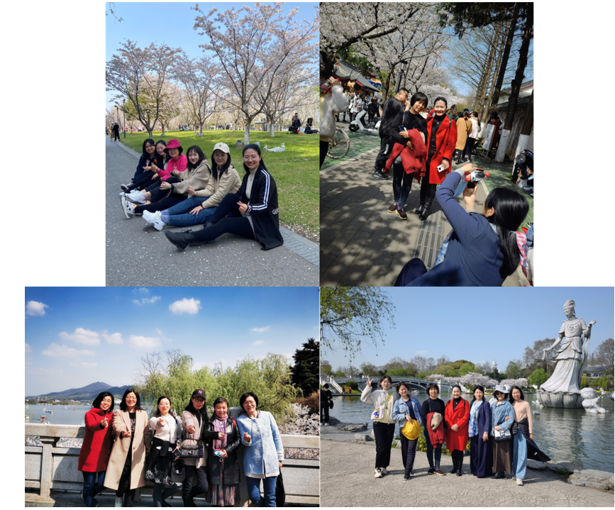 随后老师们便自由活动,鸡鸣寺的樱花大道上的樱花竞相绽放,老师们赞叹不已,纷纷拿出手机拍照。玄武湖里百花齐放,春意盎然,老师们几人一波,或欣赏美景,或边走边聊,或用手机记录下这美好的时刻。每一位女老师的脸上都洋溢着幸福快乐的笑容!