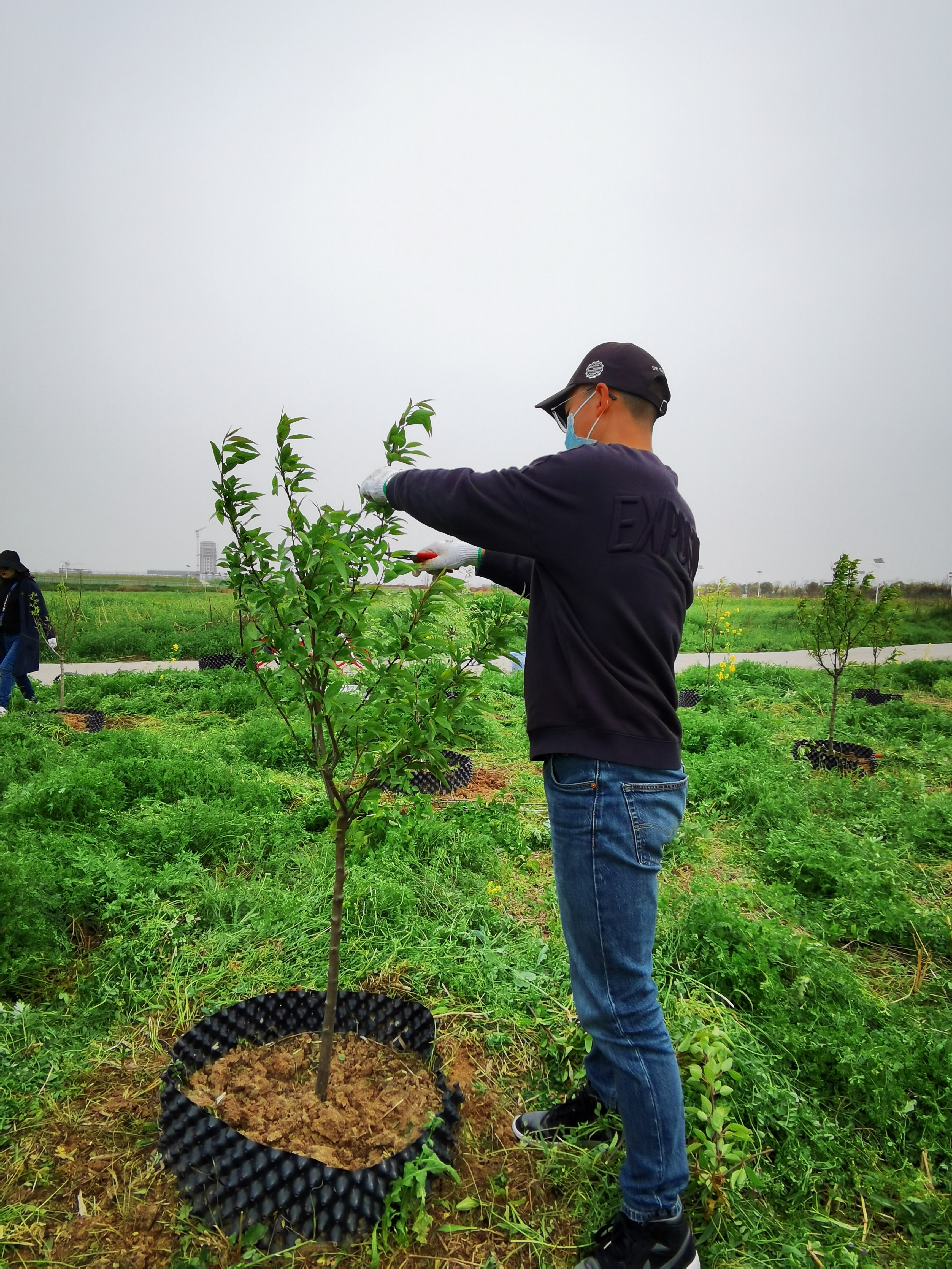 此外,在种植树木的过程中,还要为树苗安装限根器,遵循“一垫二提三埋四踩”的原则,即在挖好的树坑内垫上松土、栽种树木的时候提提树干、将埋树的土分三次埋下、每埋一次要踩实土壤,其间至少要踩四次。最后,再浇一桶兑有生根粉的水浇水。这些步骤过程虽繁琐,却能大大提高树苗的成活率,而安装限根器则是一种在果树种植中常用的方法,将植物的根域控制在一定范围内,通过控制根系的生长来调节地上部分的营养生长和生殖生长,控制水分、促进土壤改良。
