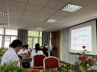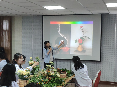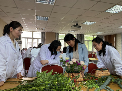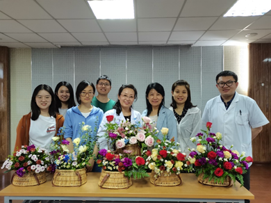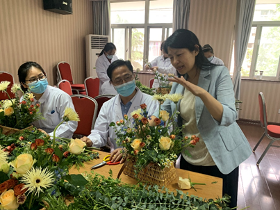 医护人员举办插花培训,以备今后工作和生活中的“不时之需”。陈素梅书记从花器的选择、花材的形态、色彩的设计、插花类型等方面详细讲述插花的入门技巧,并带领支部党员现场指导医护人员插花。白衣天使们,在轻松愉快的氛围中巧手翻飞,享受着插花艺术带来的乐趣,娇艳的玫瑰、温馨的康乃馨、淡雅的小菊花等花材,很快变身成一个个精美的艺术品,或高雅格调,或清新怡人。陈书记还带领支部成员和研究生同学,特意为值班不能参加活动的医护工作者制作插花作品,以送上节日的温馨问候。
