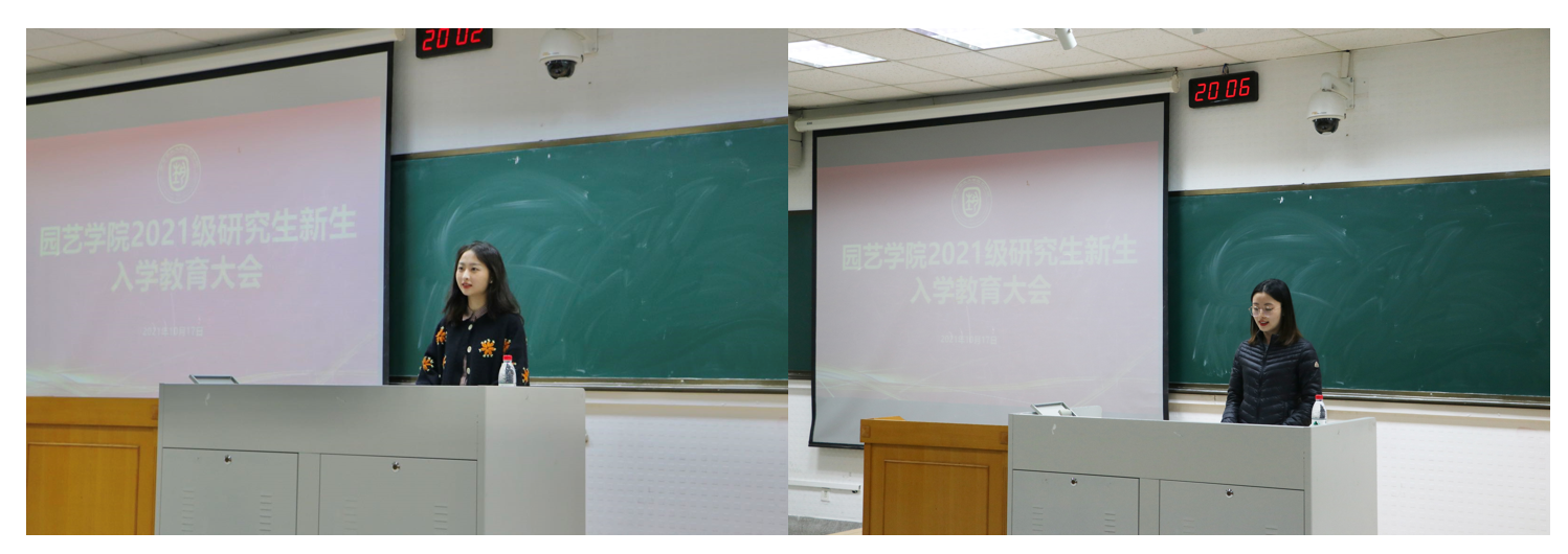 专硕沈妍向新生们分享了她的学习思考,建议新生们建立自信,重视学习,放手去做,走出没有局限的人生。新生代表2021级果树学博士朱晓璇与大家共同探讨了自己的规划,作为果树学博士研究生她将努力让梨花更美、梨果更甜、梨农更富。