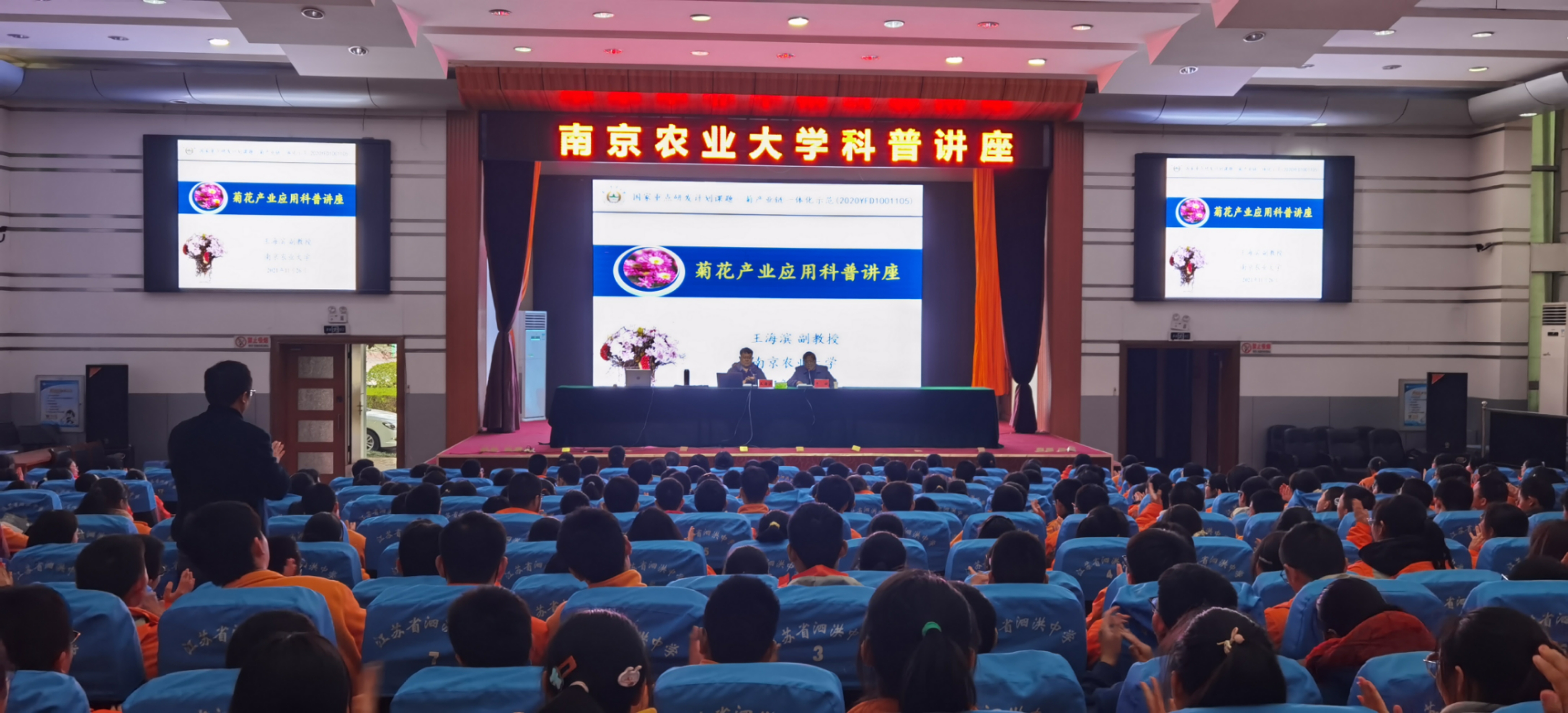 在泗洪中学,王海滨为700余名学生作了题为《菊花产业应用科普》的知识讲座。王老师从“采菊东篱下,悠然见南山”的菊花文化开始,讲述了菊花在花卉产业中的地位及观赏、药用、食用价值等,展示了各色菊花新品种,说到了成人影院