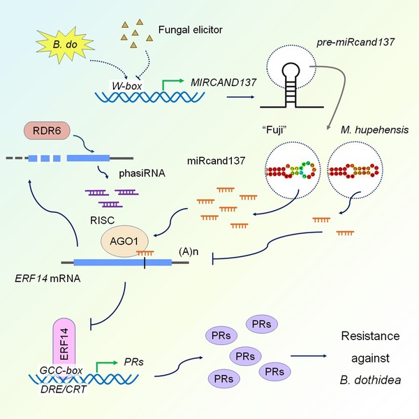 果树生物技术实验室渠慎春教授团队题为“MicroRNA candidate miRcand137 in apple is induced by Botryosphaeria dothideafor impairing host defense”的研究论文,阐明了miRcand137-ERF14苹果轮纹病抗性调控模块,揭示了B. dothidea侵染下感病品种‘富士’苹果和抗性种质湖北海棠miRcand137的表达调控差异,为野生苹果种质的轮纹病抗性机制提供了新的分子基础。