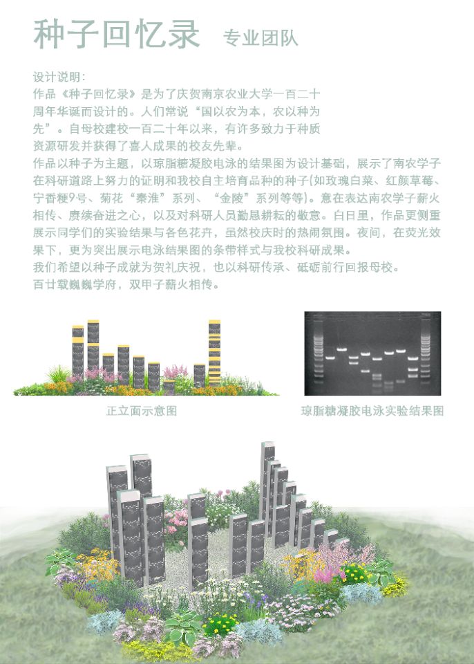专业团队组的作品《种子回忆录》,以种子为主题,以琼脂糖凝胶电泳的结果图为设计基础,展示了南农学子在科研道路上努力的证明和成人影院