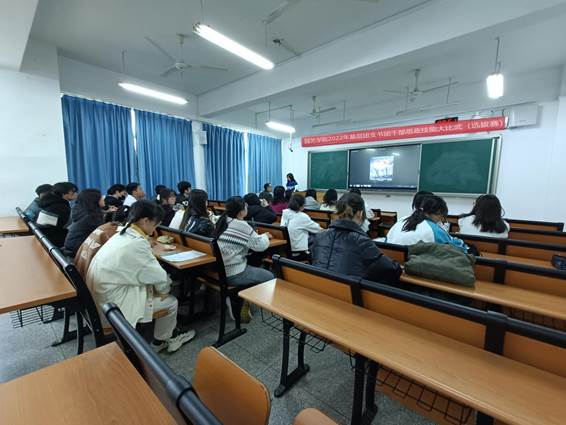 “喜迎二十大、永远跟党走、奋进新征程”基层团支书团干部思政技能大比武在教学楼A504教室顺利举办。经过前期主题团日活动录制和主题团课视频选拔,共有13名基层团支书进入院级选拔赛决赛角逐阶段。13名基层团支书依次进行主题团课现场宣讲,成人影院
