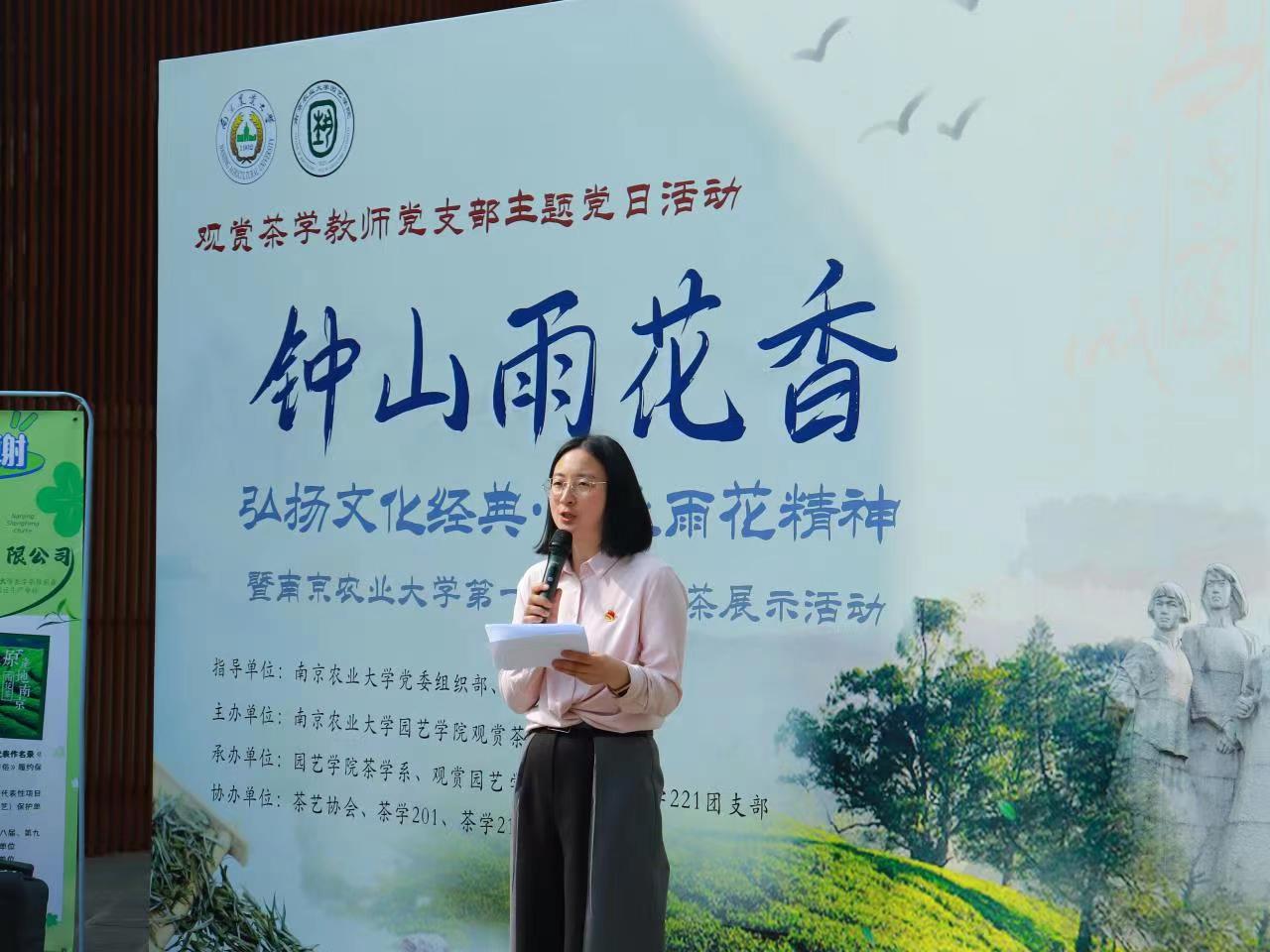 茶学学科专业的历史与发展。随后,他重点介绍了雨花茶的由来,带领青年师生重温雨花英烈精神。“雨花茶”于 1959年春创制成功,制成“形如松针,翠绿挺拔”的茶叶产品,以此来意喻革命烈士忠贞不屈、万古长青,使人饮茶思源,表达对雨花台革命烈士的崇敬与怀念。同时雨花茶也蕴含着深厚的茶历史文化内涵,很好地体现了工匠精神、匠心精神。因此雨花茶是一款纪念和缅怀革命烈士的茶,也是一款爱国茶。习近平总书记在江苏考察期间指出:“在雨花台留下姓名的烈士就有1519名。他们的事迹展示了共产党人的崇高理想信念、高尚道德情操、为民牺牲的大无畏精神。”这就是雨花英烈精神。韩健要求青年师生珍惜今天的幸福生活,弘扬雨花英烈精神,坚定信仰,勇作时代新农人,为加快建设农业强国,推进乡村振兴,实现中华民族伟大复兴作出贡献。