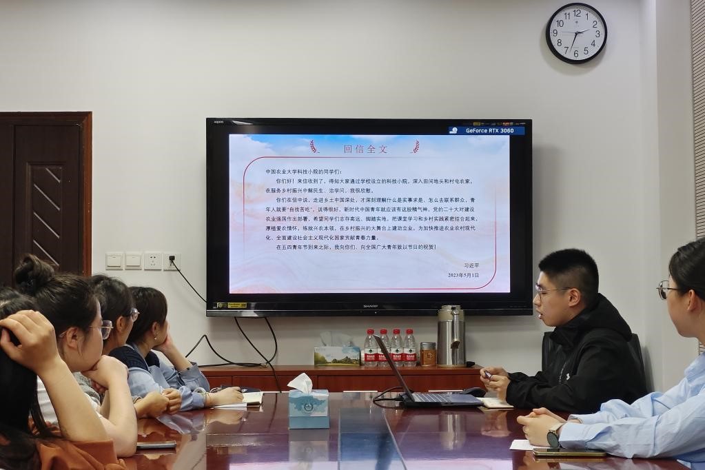 大家集中学习了习近平总书记给中国农业大学科技小院的同学们的回信全文内容。硕士生鲍婷婷、刘畅、张毓等同学结合自身科研实践以及长期身处田间地头的实践经历积极发言,分享了身为一名青年党员同时也是一名农业类高校研究生,应当如何“自找苦吃”、厚植爱农情怀,应当怎样将调查研究之风切实融入到自己的课题研究学习中的经验与感受。窦靓表示,大家要以科研工作实践经历为契机,在“田间地头”把基层作最好的课堂,在“乡土中国深处”将课堂学习和乡村实践紧密结合,在乡村振兴的大舞台上脚踏实地贡献青春力量。