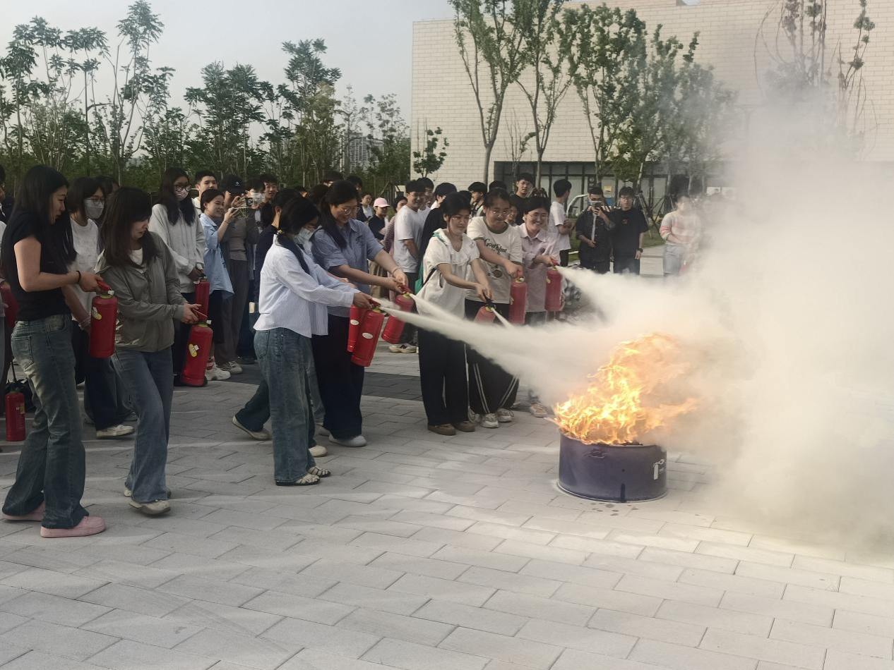 室外消防演练环节,在保卫处工作人员的指导下有序开展。师生亲身体验了现场如何正确使用灭火毯、灭火器等消防器材,收到了实训演练的预期效果。