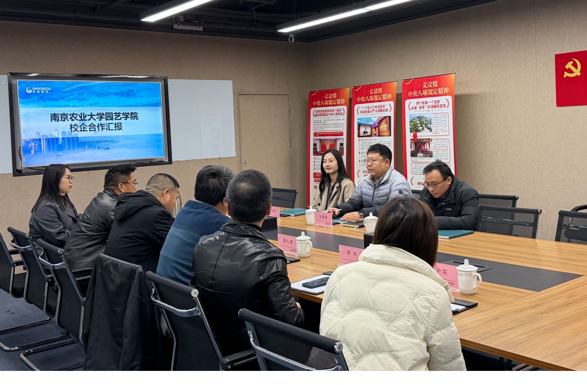王海滨一行参观了企业展厅,详细了解了公司的发展历程、业务范畴、核心项目及技术成果。百绿园林作为一家集园林规划设计、施工养护、苗木培育与生态修复于一体的综合性企业,长期致力于绿色生态建设,在行业内具有显著影响力。展厅内,校企合作成果展示区尤为引人注目,体现了企业在技术研发、人才培养等方面与高校紧密合作的积极实践。