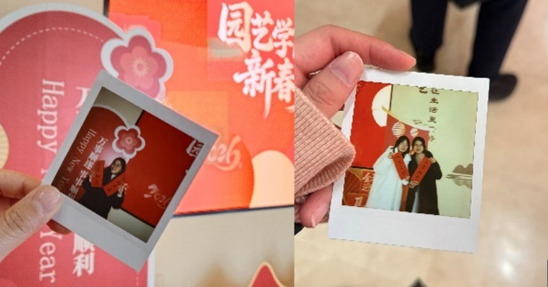 座谈会后,年味十足的新春游园会拉开帷幕,现场气氛热烈、其乐融融。在“迎春送福”对联书写区,同学们铺纸研墨、提笔挥毫,将美好的新年愿景凝于笔端。在猜灯谜区同学们驻足沉思,在智慧碰撞中体验传统游艺的乐趣。趣味投壶与套圈游戏吸引了众多学生参与,现场掌声喝彩不断。拍立得留影点前,一张张即时成像的相片定格了欢声笑语,也留存了温暖的新春记忆。游园会气氛热烈,传统年俗与青春活力交织融合,洋溢着喜迎新春的欢乐氛围。
