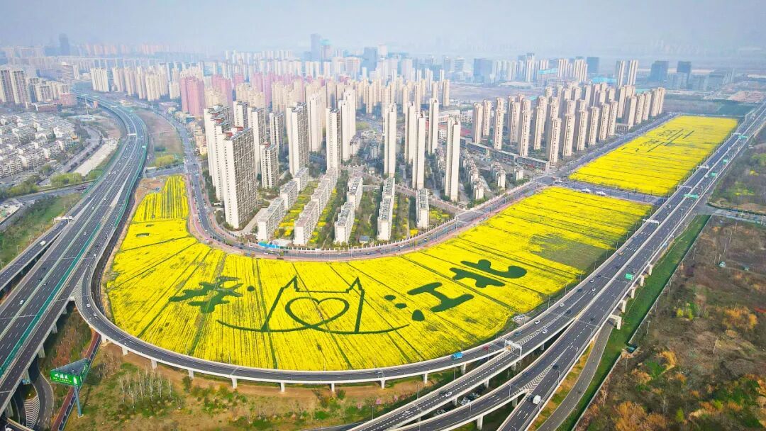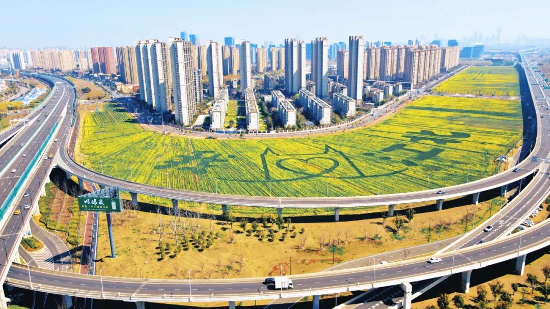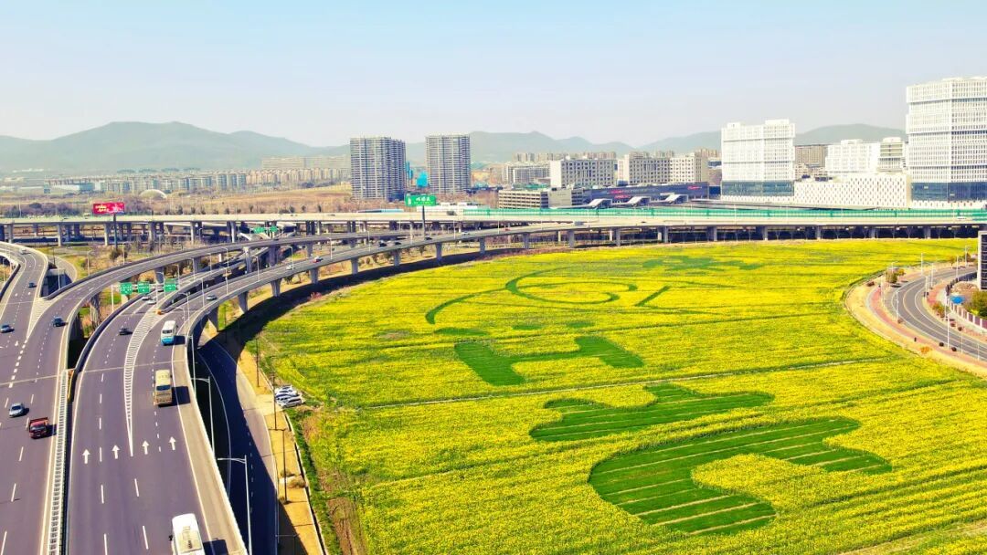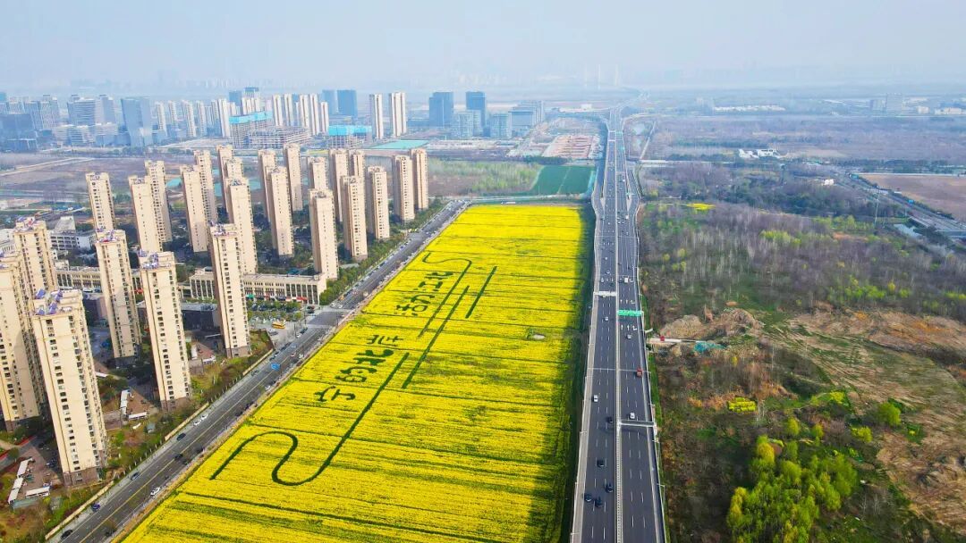 眼下,南京江北新区的一片都市田园春意盎然,连片油菜花竞相绽放,花海与大地艺术景观相映成趣,浦云路大桥等地标融入田园野趣。市民和游人徜徉花间,感受着乡土田园带来的身心疗愈。