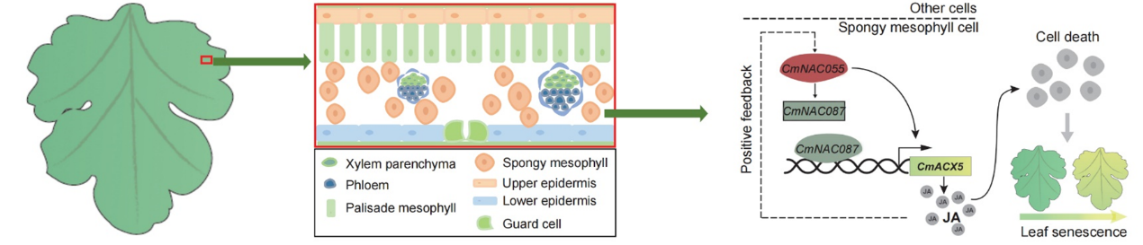 对菊花叶片衰老过程中不同类型细胞表达的基因进行分析,发现海绵组织细胞差异基因主要富集在JA等相关通路。外源茉莉酸甲基(MeJA)处理显著促进叶片衰老及各类型细胞死亡,其中海绵组织细胞的死亡加速更明显,导致其先于栅栏组织成为最早死亡的细胞。故推测JA选择性地诱导海绵组织细胞死亡,而其他类型细胞加速死亡是海绵组织细胞死亡的次生效应,可能受JA间接调控。进而聚焦到叶片衰老过程中海绵组织细胞特异被诱导表达的JA生物合成相关的基因CmAOSCmACX5。借助单细胞核转录组及ATAC-seq联合分析,挖掘到关键转录因子CmNAC055及其直接调控的下游基因CmNAC087,通过分子、生化、遗传等实验明确其直接结合调控CmNAC087并进一步促进CmACX5表达,诱导JA在海绵组织细胞积累和细胞死亡,进而揭示了海绵组织细胞特异NAC055-NAC087-ACX5转录级联模块调控内源JA合成进而诱导细胞死亡。