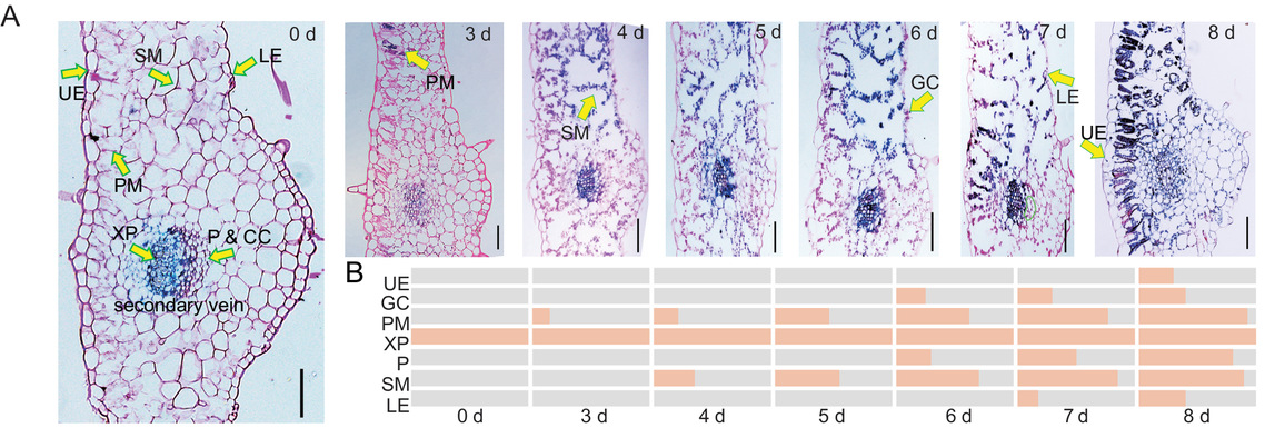 研究团队借助台盼蓝染色辅助石蜡切片观察方法,对菊花采后不同时期叶片取样观察,发现菊花叶片衰老遵循“栅栏组织→海绵组织→韧皮部、保卫细胞→下表皮→上表皮”的精准时空死亡顺序,且栅栏组织和海绵组织细胞率先启动衰老的现象在拟南芥和番茄中存在保守性。