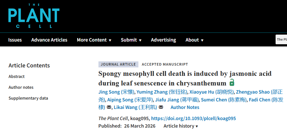3月26日,成人影院 菊花遗传育种与种质创新团队在《The Plant Cell》期刊在线发表了题为“Spongy mesophyll cell death is induced by jasmonic acid during leaf senescence in chrysanthemum”的研究论文,揭示了叶片衰老过程中不同细胞死亡时序,发现海绵组织细胞特异NAC055-NAC087-ACX5转录级联模块调控内源茉莉酸(JA)合成进而诱导细胞死亡和叶片衰老的机制,助力精准保鲜技术创新;且发现这一机制在双子叶模式植物(拟南芥、番茄)和单子叶模式植物(水稻)中高度保守,丰富了植物叶片衰老调控网络。