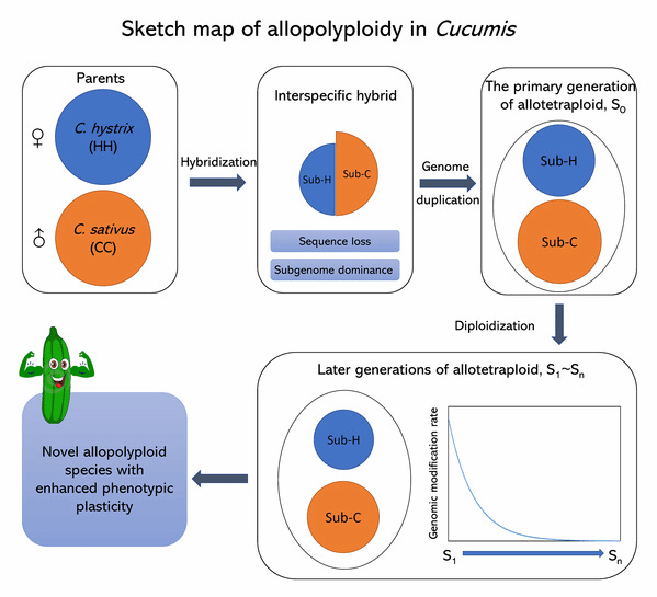 近日,成人影院 成人影院 陈劲枫教授团队在《Advanced Science》(中文期刊名:《尖端科学》,2019年影响因子15.84)在线发表了研究论文“Whole-Genome Sequence of Synthesized Allopolyploids in CucumisReveal Insights into the Genome Evolution of Allopolyploidization”(doi:10.1002/advs.202004222)。该研究历经20多年,围绕甜瓜属人工异源四倍体新物种“金瓜”(gocumber)开展了系统深入研究,完成了世界首例人工合成异源多倍体全基因组测序,揭示并初步阐明了在异源多倍化物种形成三个阶段中,种间杂交的作用最为显著,以及亚基因组优势形成机制等多倍体研究重要科学问题,对于加强植物多倍化研究及作物育种利用具有重要意义。