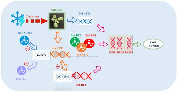 本研究发现了BcZAT12与BcZAT10负调控不结球白菜耐寒性,首次证明了BcZAT12蛋白能够与BcABF2/BcABF4蛋白互作,同时发现NAC家族成员BcNTL4/BcNAC055能够结合BcZAT12启动子上的G-BOX元件,而BcZAT12与BcCBF1上的ACT核心元件结合,提出了BcZAT12与BcZAT10影响不结球白菜耐寒性的模型(图7),为进一步探究不结球白菜耐寒调控网络奠定了基础,同时也为不结球白菜遗传改良耐寒品种提供了新思路。
