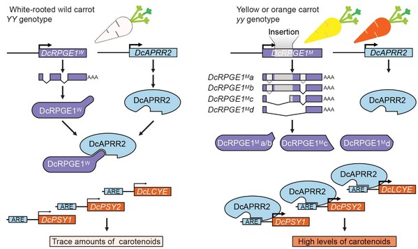 本研究发现DCAR_032551编码一个RPGE (REPRESSOR OF PHOTOSYNTHETIC GENES) 蛋白,将其命名为DcRPGE1。RPGEs是一类在高等植物中广泛存在且序列高度保守的小蛋白。以往研究报道发现RPGEs能够抑制叶绿素合成。而本研究发现野胡萝卜的DcRPGE1 (DcRPGE1W)是类胡萝卜素合成的抑制因子。DcRPGE1W能与转录因子DcAPRR2 发生相互作用。APRR2在许多植物中是类胡萝卜素和叶绿素合成的正调控转录因子。在野胡萝卜中,DcRPGE1W抑制了DcAPRR2介导的类胡萝卜素合成关键基因DcPSY1、DcPSY2和DcLCYE的表达,从而抑制类胡萝卜素的合成。而黄色和橙色胡萝卜中DcRPGE1(DcRPGE1M)编码区存在突变,导致其只能编码短截的蛋白,这些蛋白无法与DcAPRR2相互作用,从而无法抑制类胡萝卜素的生物合成。这些发现为类胡萝卜素生物合成的转录调控提供了新见解,并为利用基因编辑增强作物中类胡萝卜素积累提供了新的潜在靶位点。