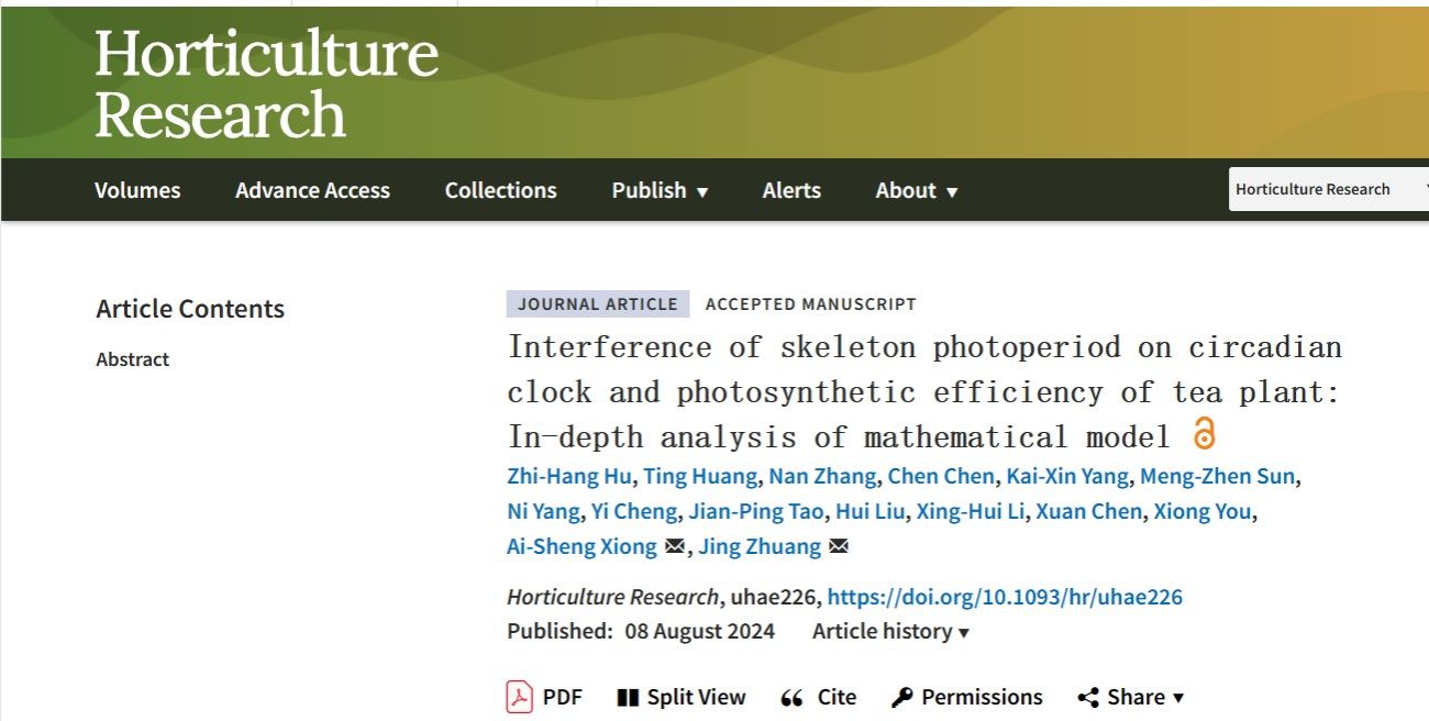 茶学学科庄静教授课题组题为Interference of skeleton photoperiod on circadian clock and photosynthetic efficiency of tea plant: In-depth analysis of mathematical model的研究论文,该研究分析了不同光周期路径下的茶树昼夜节律组成,揭示了茶树光合作用昼夜节律调节的潜在机制。