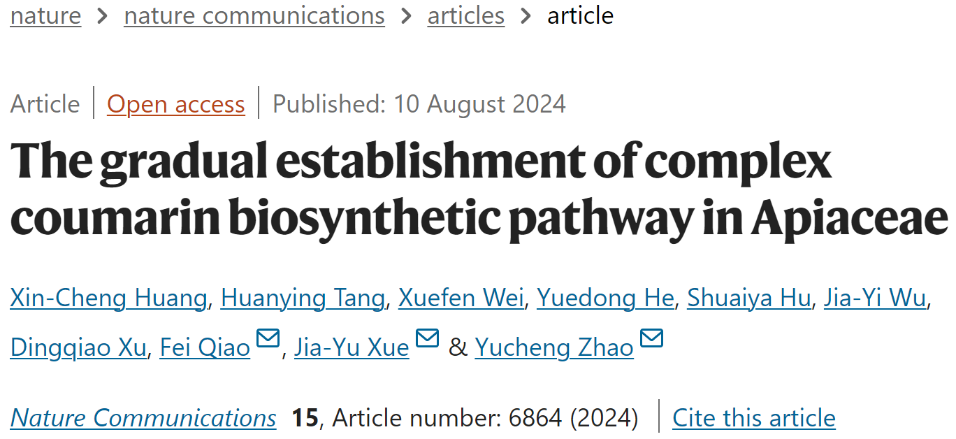/前沿交叉研究院薛佳宇团队与合作者在《自然·通讯》(Nature Communications)上发表了题为“The gradual establishment of complex coumarin biosynthetic pathway in Apiaceae”的研究论文,重构了伞形科中复杂香豆素生物合成通路起源与进化的详细过程,揭示了形成科内复杂香豆素产物多样性的分子机制。