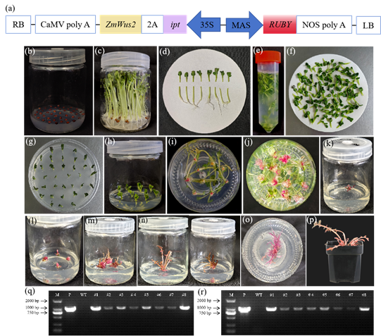 发育调节因子(Developmental Regulators, DRs)可以改变植物细胞发育命运,重新诱导分生组织形成,这种方式获得的分生组织在植物遗传转化应用上拥有巨大潜力。团队成员选取多个不同DRs因子组合进行萝卜再生诱导研究,发现Wus2-ipt组合可以促进愈伤组织形成,同时可在伤口部位直接诱导再生芽。综合利用Wus2-ipt组合、可视化报告基因RUBY、基于发根农杆菌介导的转化体系建立了萝卜简单、高效的遗传转化再生和基因编辑系统,再生芽诱导与生长无需添加任何外源激素,且利用早抽薹基因型获得转基因种子仅需6-7个月,成功打破萝卜遗传转化的技术瓶颈,可加快萝卜基因功能验证和种质创制进程,同时将为其它成人影院