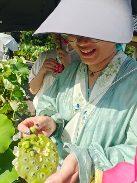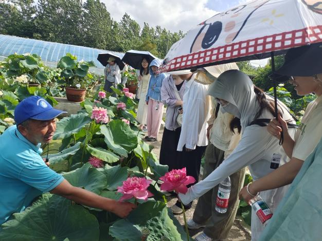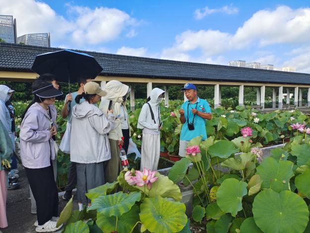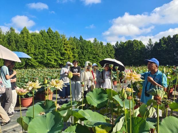 兼职教授丁跃生带领下,大家步入南京浦口艺莲苑花卉有限公司荷花基地,千余个自主培育与收集引进的荷花品种正值盛放、香远益清、姿态万千。丁老师在系统介绍荷花种质资源情况及产业发展现状的同时,也引导大家进行了多感官体验。丁老师潜心荷花育种十余年,他深情地回顾了自身在科研道路上遇到的技术挑战与艰苦条件,分享中同学们深刻感受到以丁老师为代表的科研人员在艰难环境中坚守初心、持续奋斗的历程,以及推动中国荷花走向国际、传播中华荷文化的实践与思考。党员们深受触动,不仅感动于老一辈育种人坚韧不拔、迎难而上的精神,也对淡泊名利、潜心研究的科研操守有了更深刻的理解,更为我国丰富的荷花种质资源与不断提升的科技实力感到自豪,民族认同与文化自信进一步增强。
